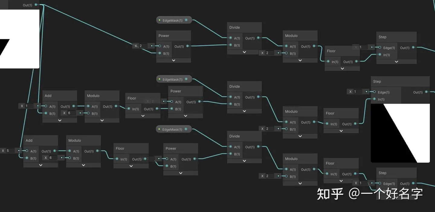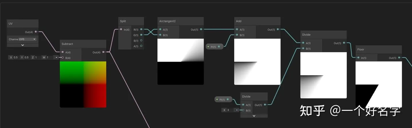 Arctangent2接受来自偏移UV坐标的值来获得对应的角度。通过整除来将 360 度分割为 6 个扇区(0 到 5)。这里可以看出如果使用尖顶在上的UV展开,进行扇区划分会非常痛苦。