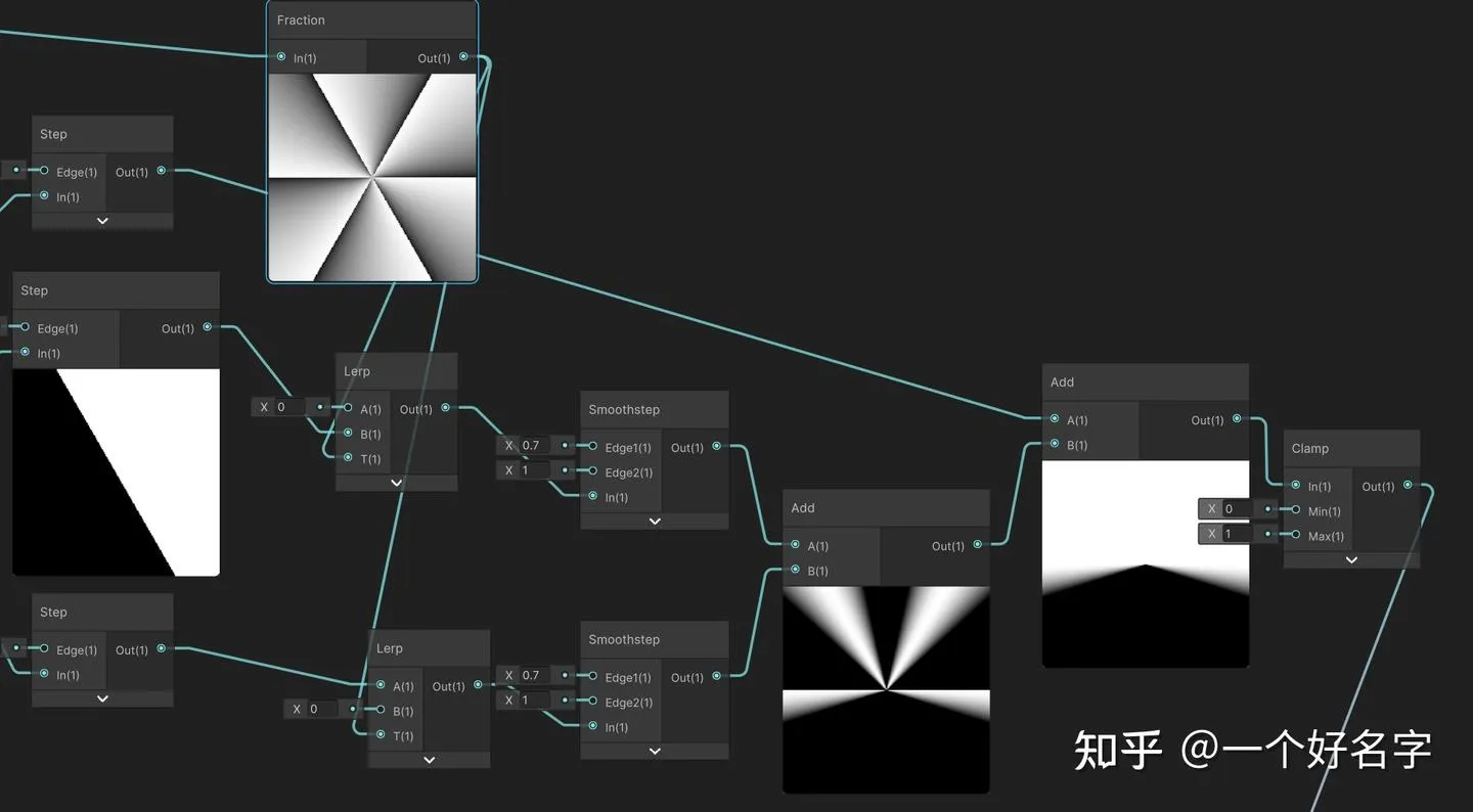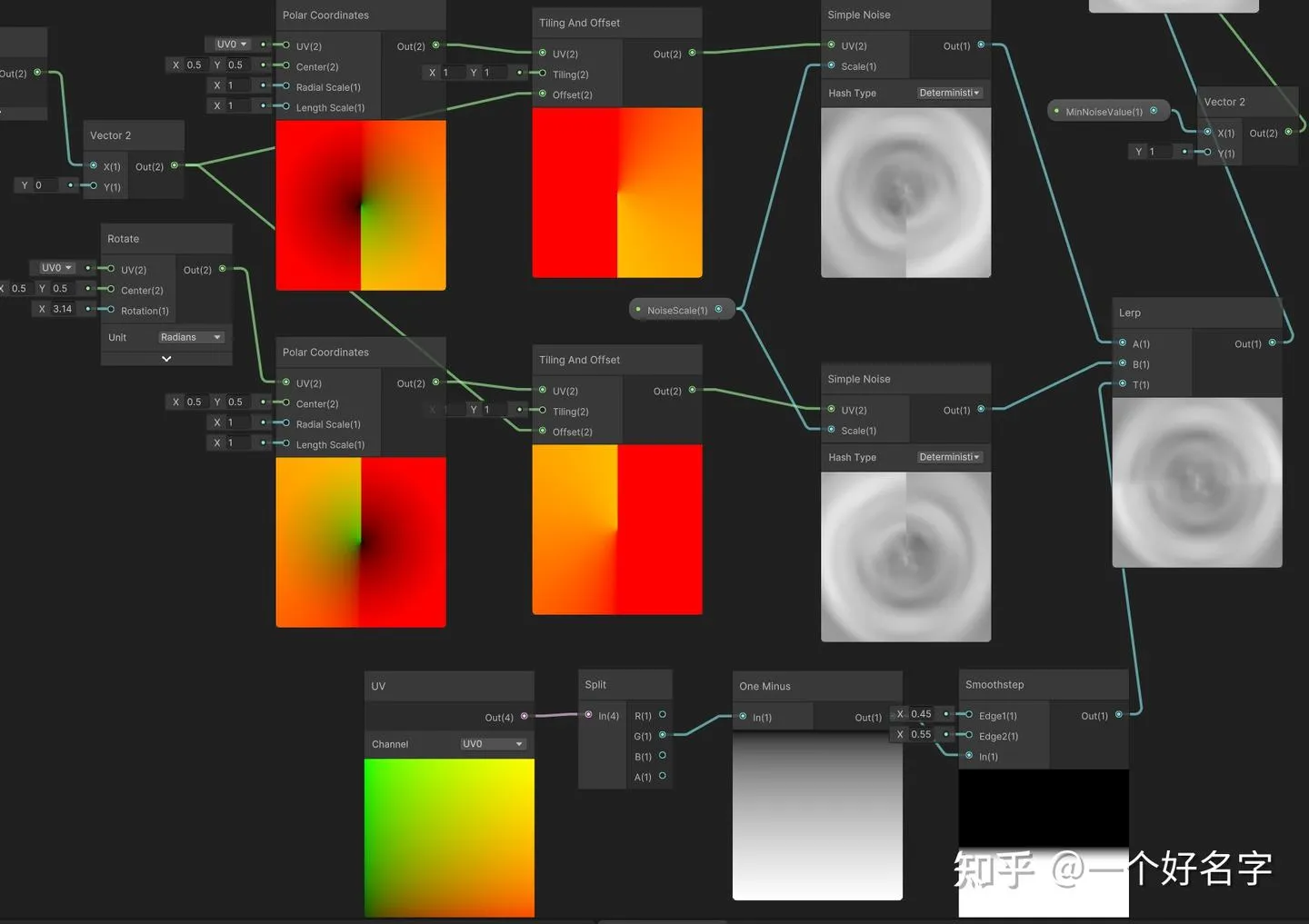 可以看到极坐标UV在中间下方有明显的接缝。为了解决这个问题,我们可以复制上面的流程,并旋转180度,获得一张上方有接缝的极坐标UV,之后选取第一张的上面部分,选取第二张的下面部分重新缝合(这里重新整了个smoothstep来获得过渡丝滑的插值)即可解决。