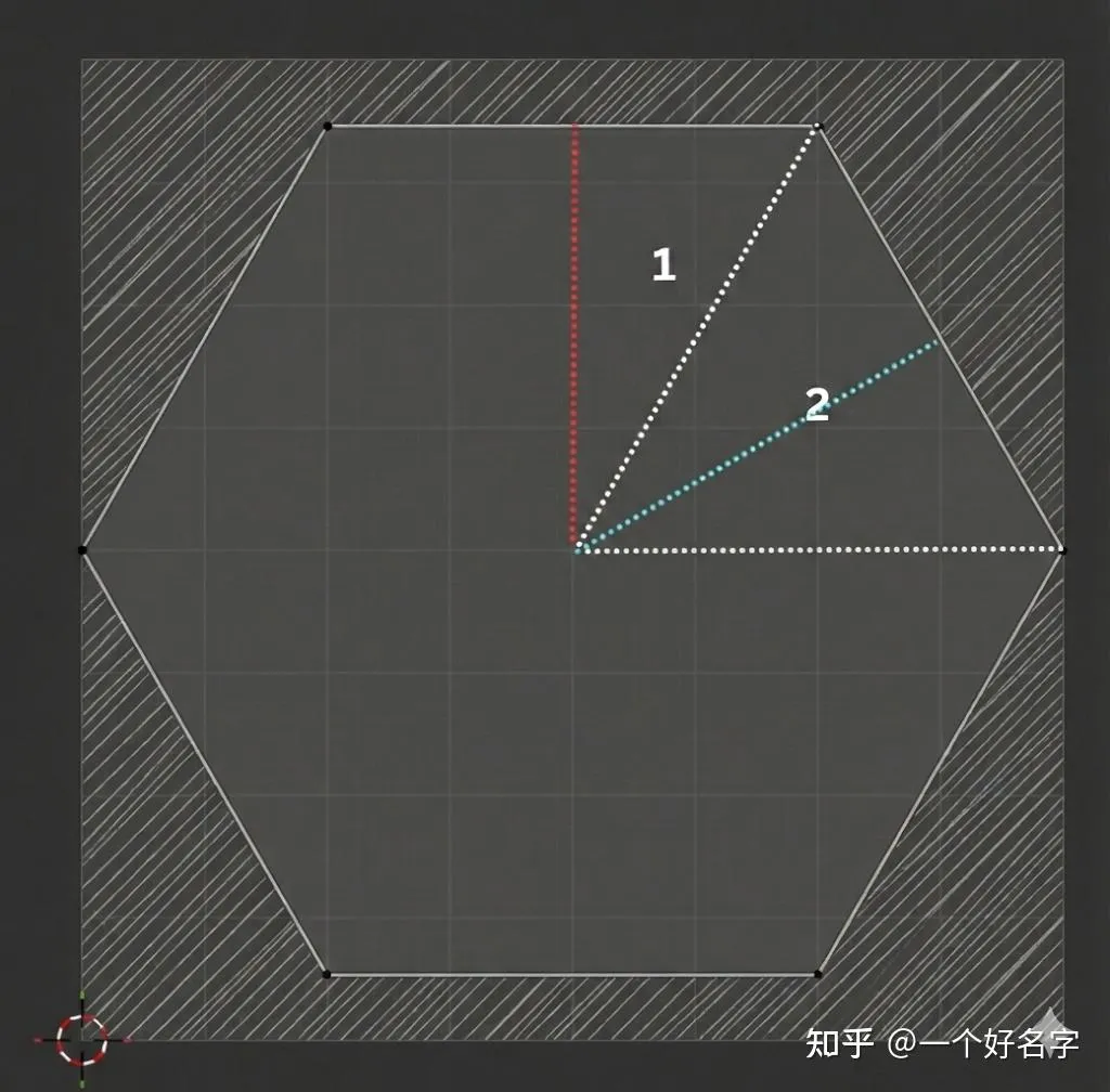 对于图中区域2,蓝线为基准轴,将区域2中的点投影至基准轴上,基准轴的方向向量为 (根号三/2, 1/2), 故最终的sdf为 ∣x∣⋅0.866+∣y∣⋅0.5 (根号三/2为0.886)。
