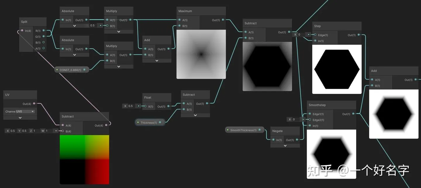 Absolute节点处理 X 和 Y,这样我们需要计算的象限就减少了。 - 六边形SDF 则可以参考下列文章的推导办法,这里简单说明一下大致的过程。